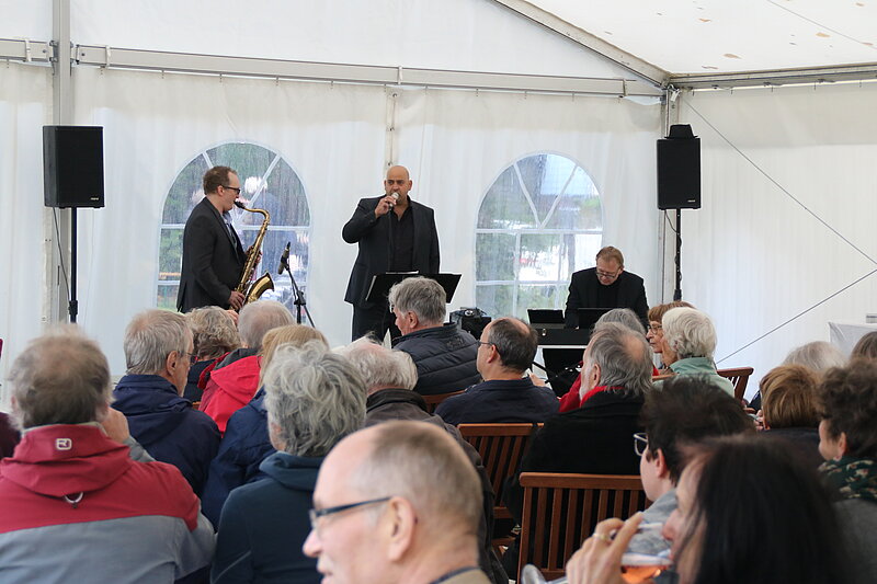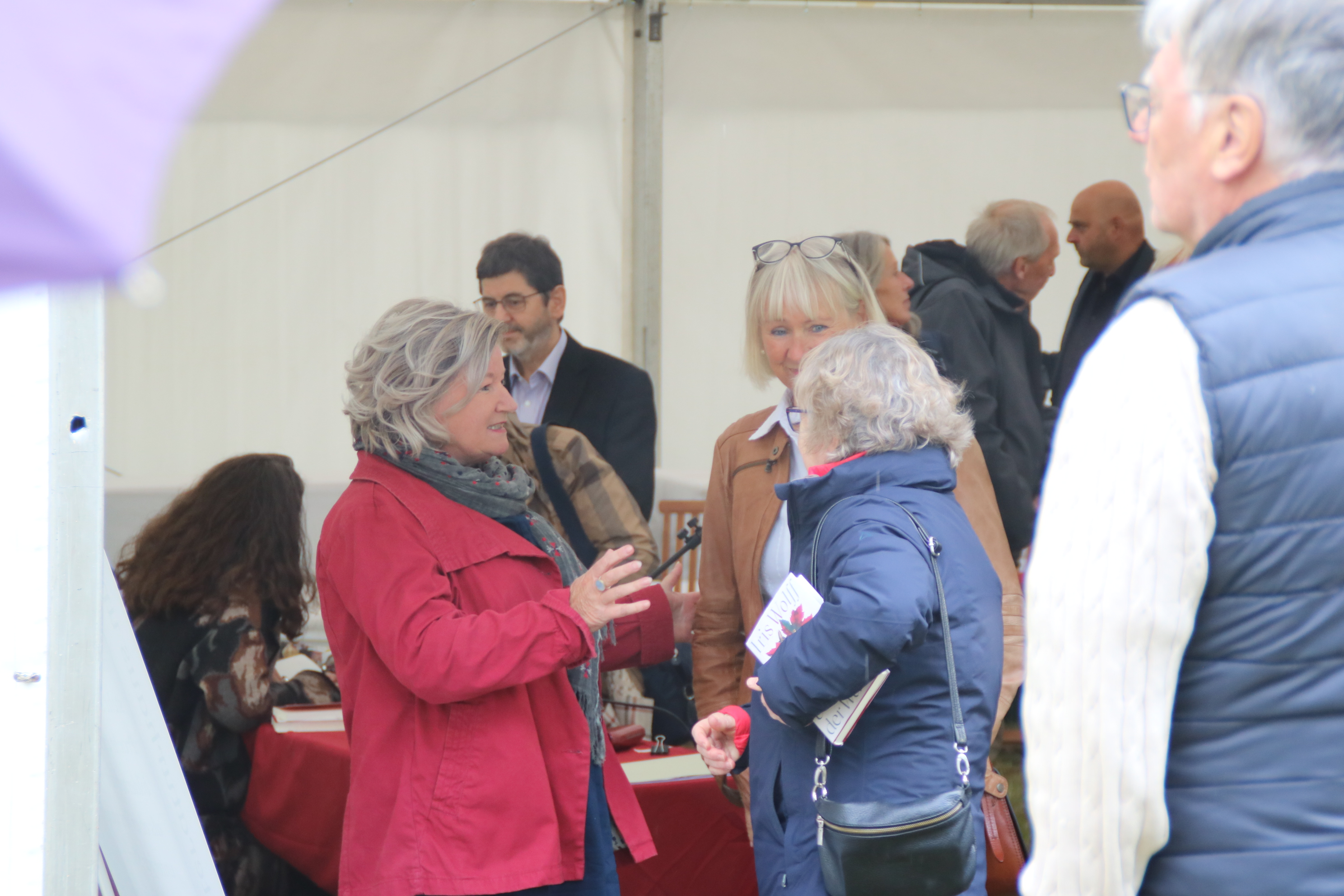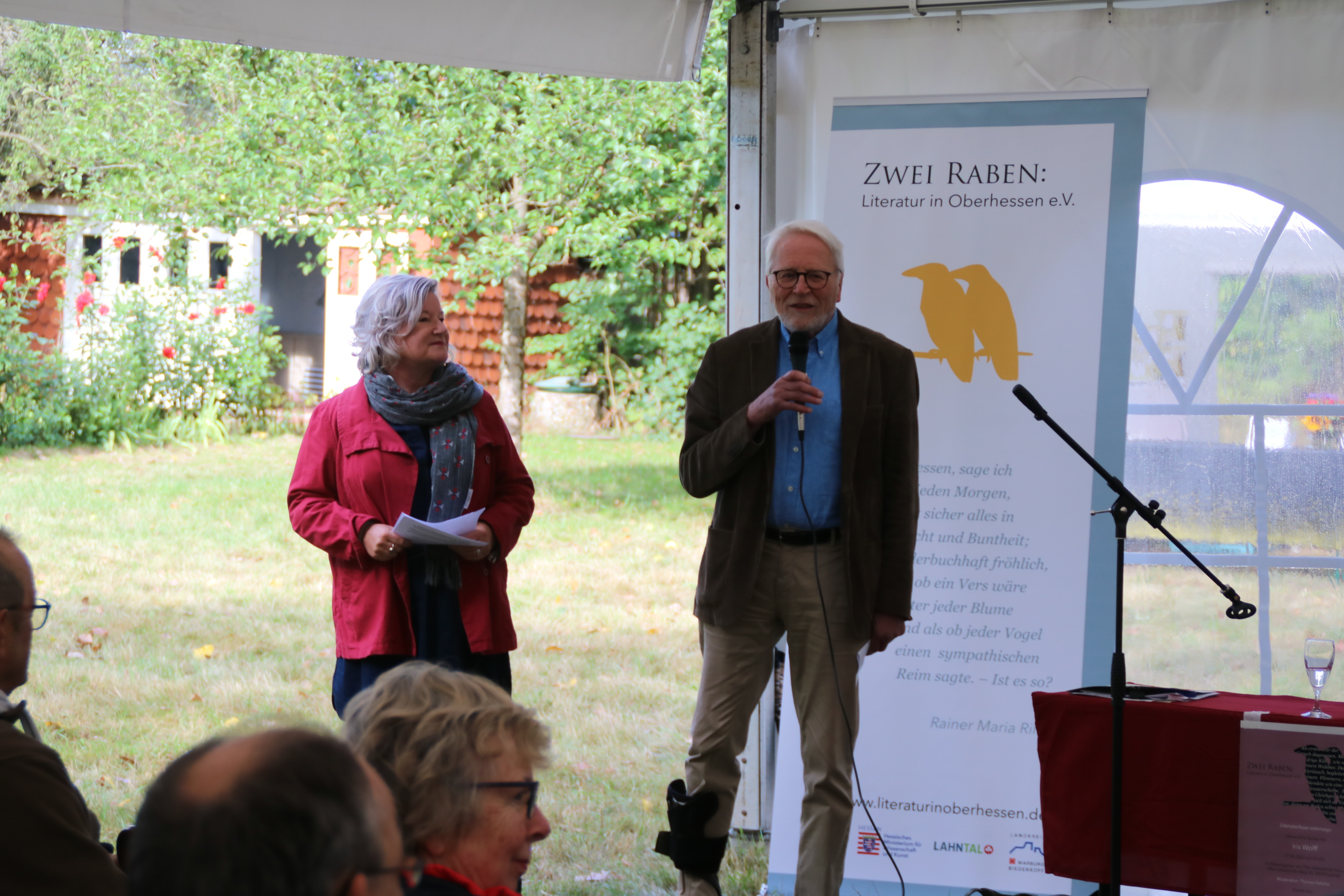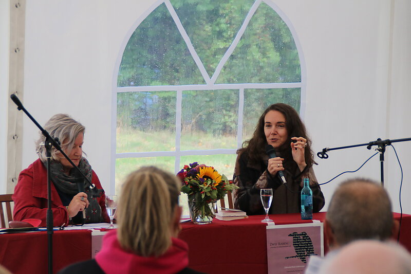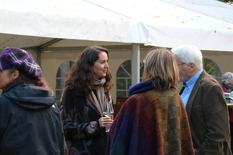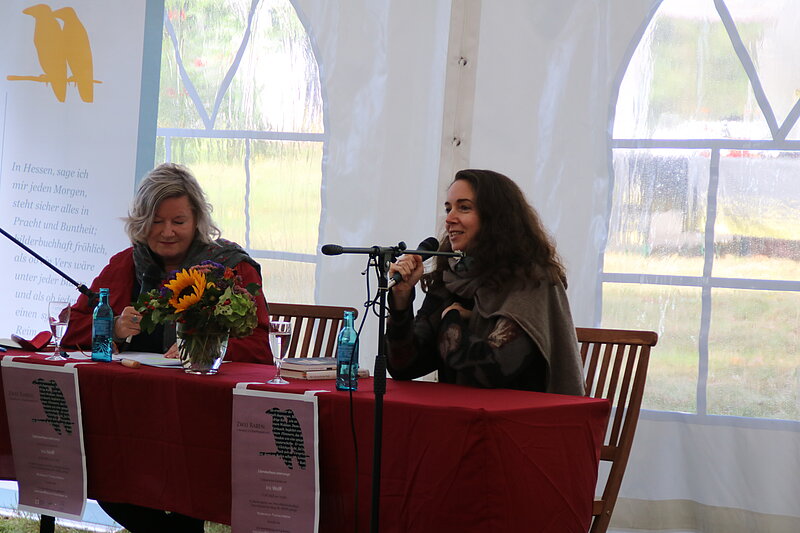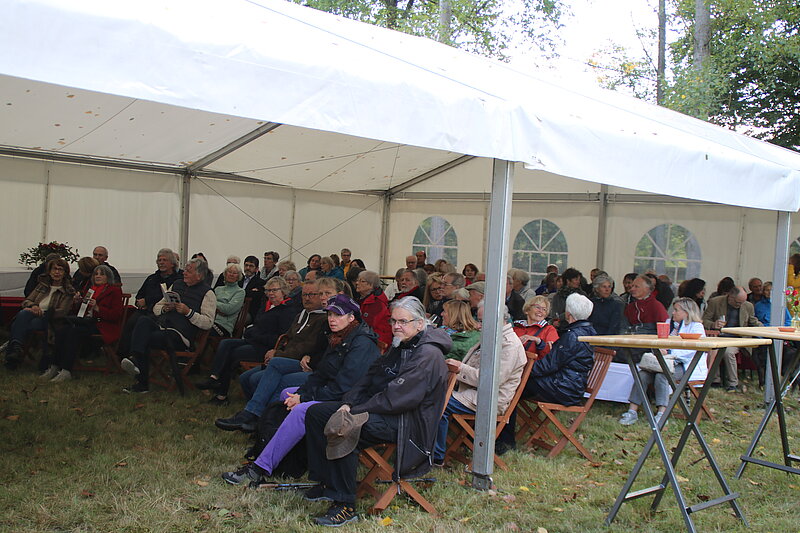 In den letzten Jahren hatte der Verein Glück mit dem Wetter und von Beginn war bei allen Veranstaltungen strahlender Sonnenschein ein Programmpunkt. In diesem Jahr sollte es mal anders sein, aber es tat der Lesung und dem Gespräch keinen Abbruch. Gebannt und verzaubert hörten die rund 100 Besuchenden der Moderatorin Erika Schellenberger, die für den erkrankten Thomas Hettche einsprang, und der Autorin zu.