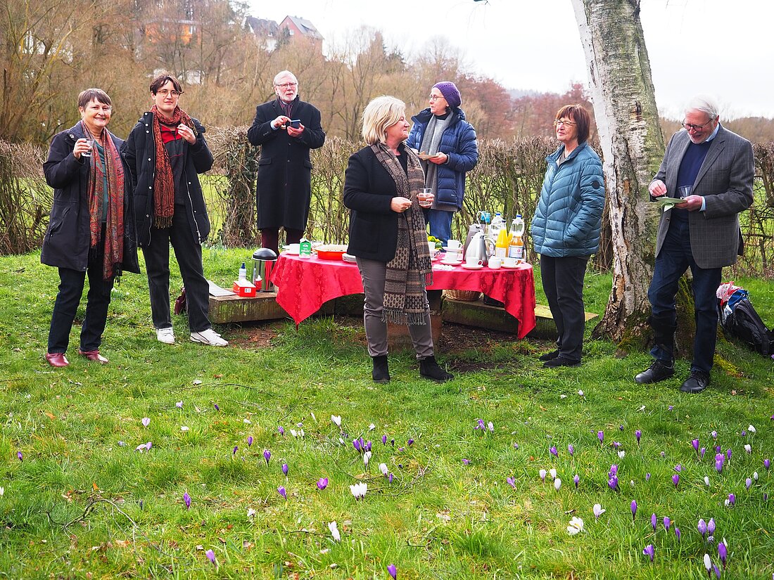 Sandra Burkhardt wurde im kleinen Kreis begrüßt. Am Bahnhof von Goßfelden wurde sie am Nachmittag von Frau Dr. Schellenberger und Karl Heinz Görmar abgeholt. Das Wetter hat mitgespielt und so hatte die Schriftstellerin die Gelegenheit, auf der Wiese vor dem Ubbelohde-Haus mit Blick auf die vielen blühenden Schneeglöckchen und Krokusse einige Vereinsmitglieder bei einem Picknick auf Abstand kennenzulernen.